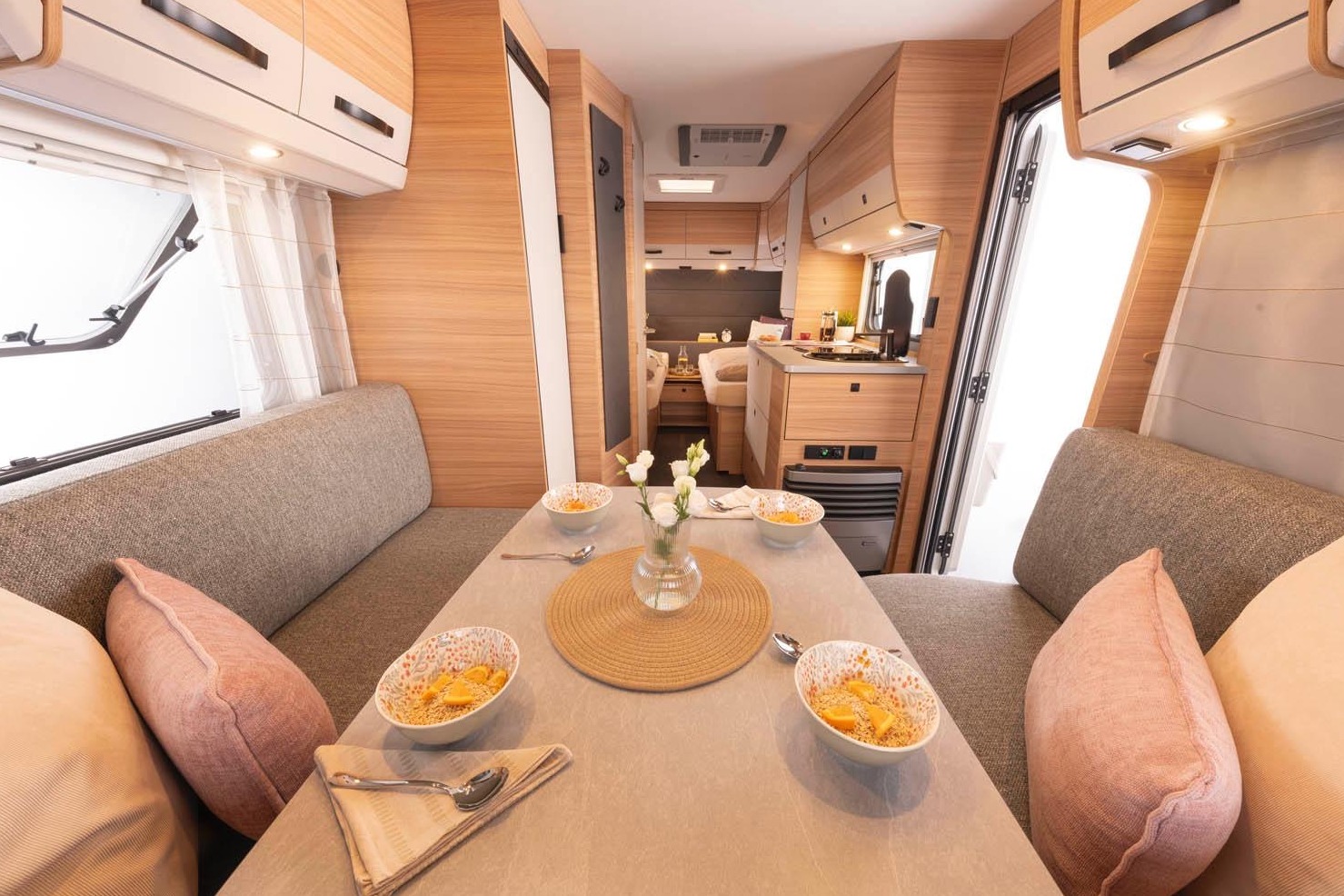 indeling met zithoek achterin en enkele bedden voorin