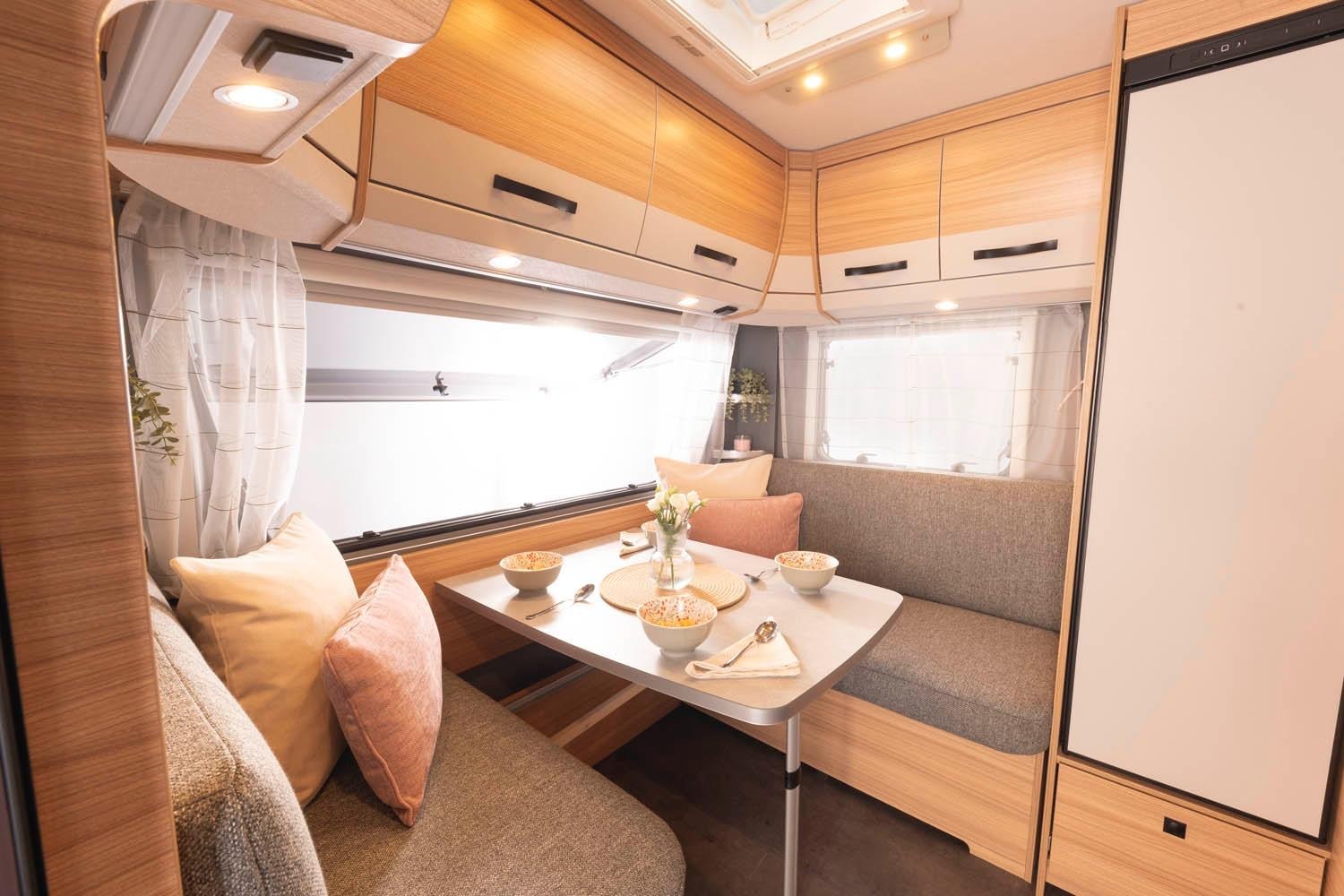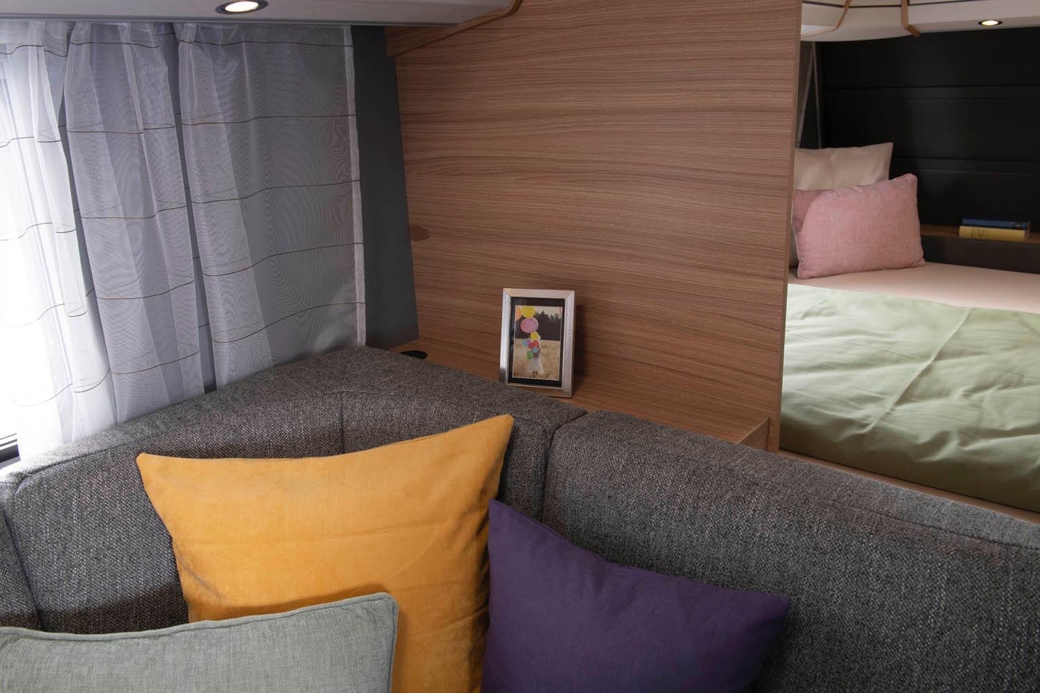 indeling met fransbed voorin, middenzit en stapelbed achterin