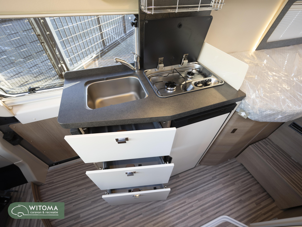 Sjorsysteem bagageruimte, upgrade keuken, Truma CP plus digitaal bedieningspaneel, microvezel dakbekleding, schoon/vuil-water tank geïsoleerd, hoogwaardige koudschuimmatras, ambiente verlichting.