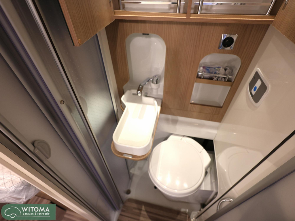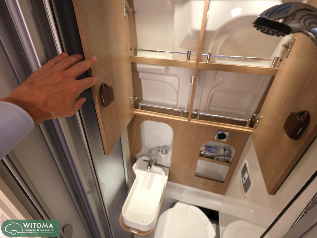 Wat kenmerkend is voor deze 5m99 korte versie met lengtebedden is de enorme bergruimte die we in elk hoekje en gaatje vinden. Wat een slimmigheden zijn hiervoor bedacht. Zo treffen we onder het bed aan de rechterkant een hangkast en een extra grote bergruimte aan de linkerzijde. De toilet is weg te schuiven waardoor de gehele natte cel als douche gebruikt kan worden. Hiermee wordt douchen in een buscamper realiteit! Het is niet voor niets dat een 6m buscamper zo populair is, minder kosten bij bijvoorbeeld overtochten, makkelijk parkeren en manouvreren, elk plekje wordt voor u bereikbaar.