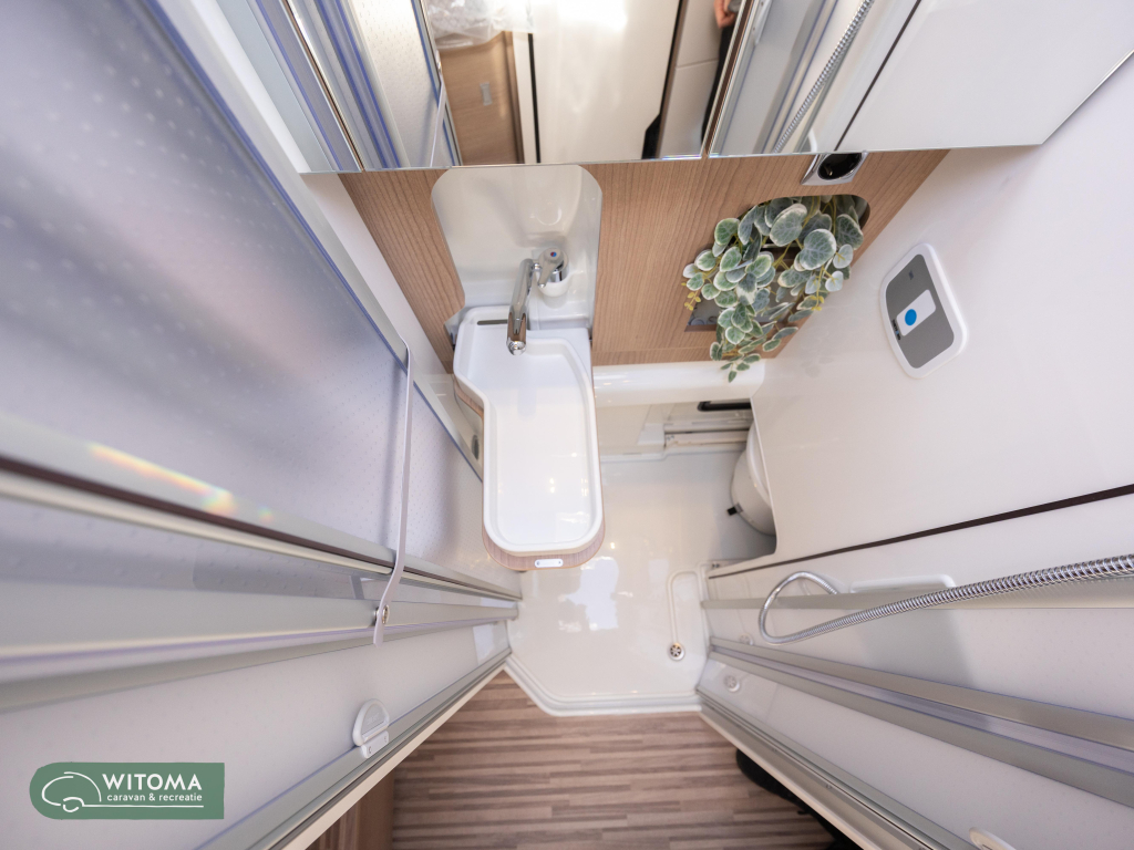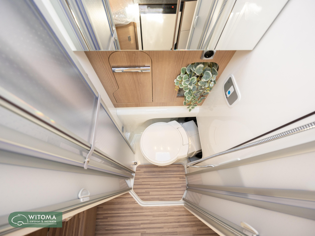 Wat kenmerkend is voor deze 5m99 korte versie met lengtebedden is de enorme bergruimte die we in elk hoekje en gaatje vinden. Wat een slimmigheden zijn hiervoor bedacht. Zo treffen we onder het bed aan de rechterkant een hangkast en een extra grote bergruimte aan de linkerzijde. De toilet is weg te schuiven waardoor de gehele natte cel als douche gebruikt kan worden. Hiermee wordt douchen in een buscamper realiteit! Het is niet voor niets dat een 6m buscamper zo populair is, minder kosten bij bijvoorbeeld overtochten, makkelijk parkeren en manouvreren, elk plekje wordt voor u bereikbaar.