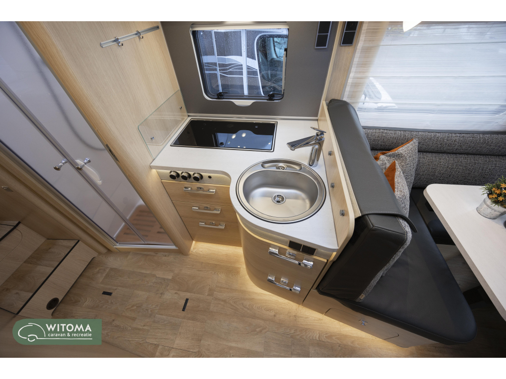Van binnen treffen we het Grand Oak interieurdecor, licht, modern en sfeervol. Natuurlijk de enkele bedden achterin met daaronder de XXL garage (132cm hoogte!!) voorin de royale L zitgroep met extra bankje en de hoekkeuken met veel bergruimte. In het midden de gescheiden toilet/wasruimte en douche. Door middel van het aansluiten van de deur van de wasruimte op de douche ontstaat achter een ensuite.