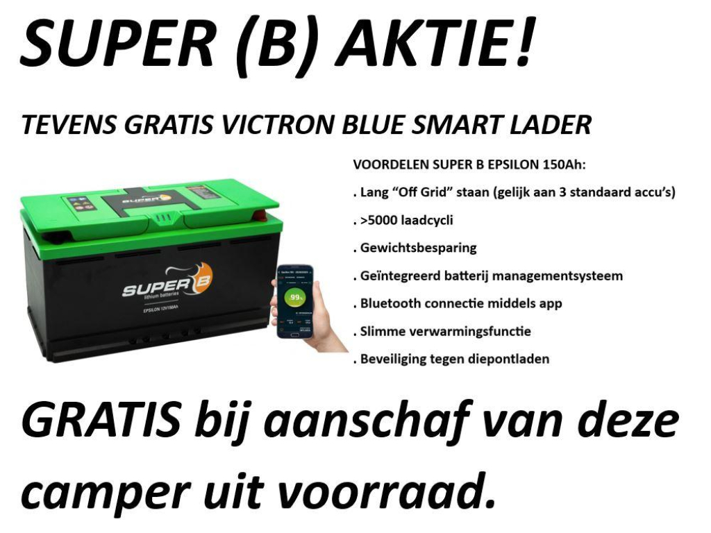 We doen ons uiterste best om alle informatie correct weer te geven. Toch kunnen specificaties of foto’s afwijken of tussentijds wijzigen. Campers die nog verwacht worden, kunnen zijn geadverteerd met voorbeeldfoto’s van zustermodellen. Hieraan kunnen geen rechten worden ontleend.