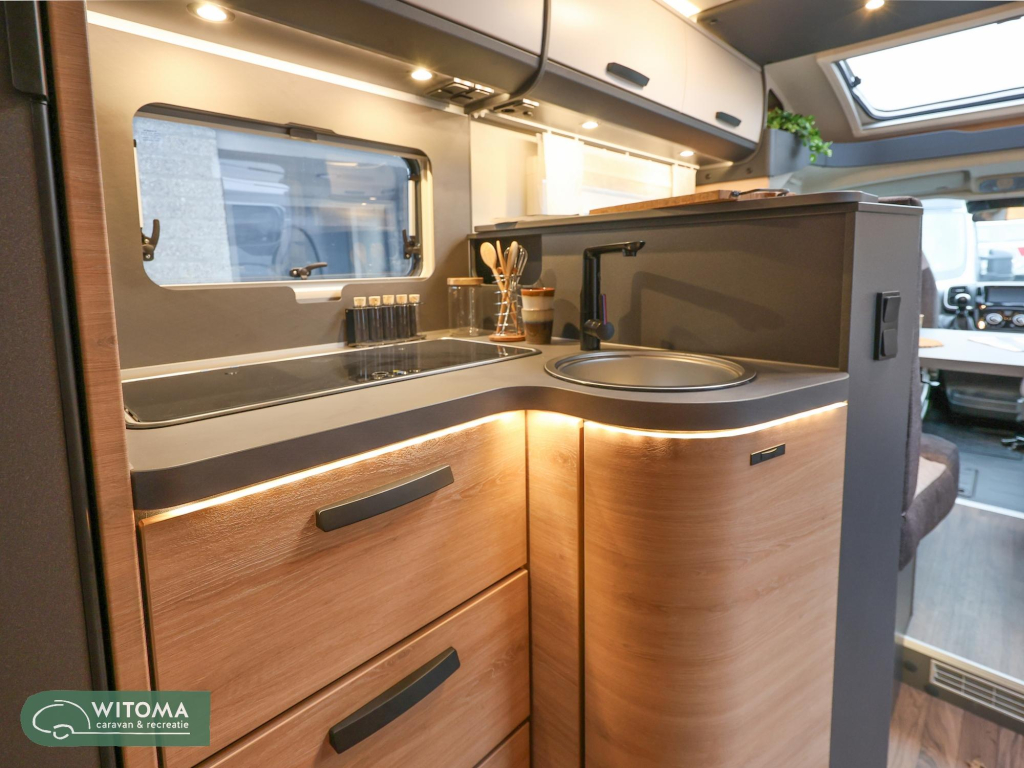 Binnen zorgt het Modern Oak-interieur met Samoa Dark-accenten voor een eigentijdse sfeer. De keuken heeft een 3-pits kookplaat en 142-liter koelkast, de badkamer een vaste douche met houten rooster, en de Truma Combi 6-verwarming maakt hem klaar voor elk seizoen.