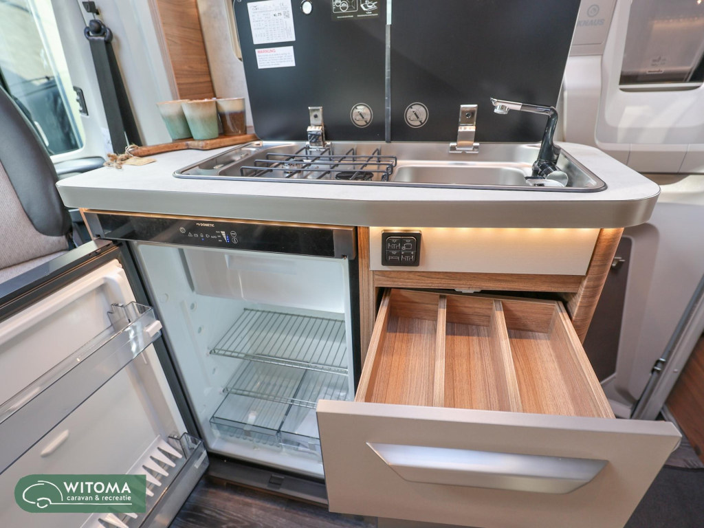 Binnen straalt de Van Ti een moderne sfeer uit met Cosy White-meubeldecor, hoogwaardige stoffering en indirecte LED-verlichting. De praktische keuken biedt een 142 liter AES-koelkast, 3-pits gasstel en veel werkruimte. Het ruime Franse bed en de L-zitgroep zorgen voor comfortabel reizen en ontspannen slapen.