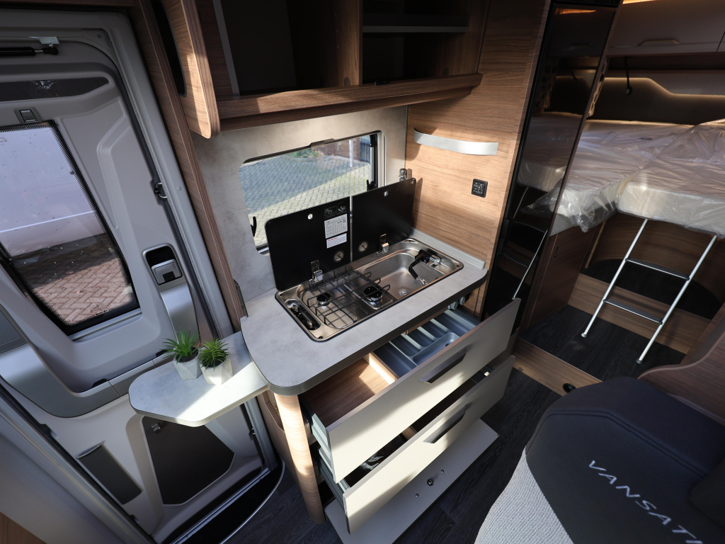 Stap in en voel je meteen thuis in deze nieuwe Knaus Van Ti 640 MEG Vansation. Een stijlvolle half-integraal camper op Volkswagen Crafter automaat (163 pk), gebouwd voor comfortabel reizen zonder concessies. Met luxe bedden, sfeervolle ambienteverlichting en een royale garage is hij klaar voor lange reizen én spontane weekendjes weg.